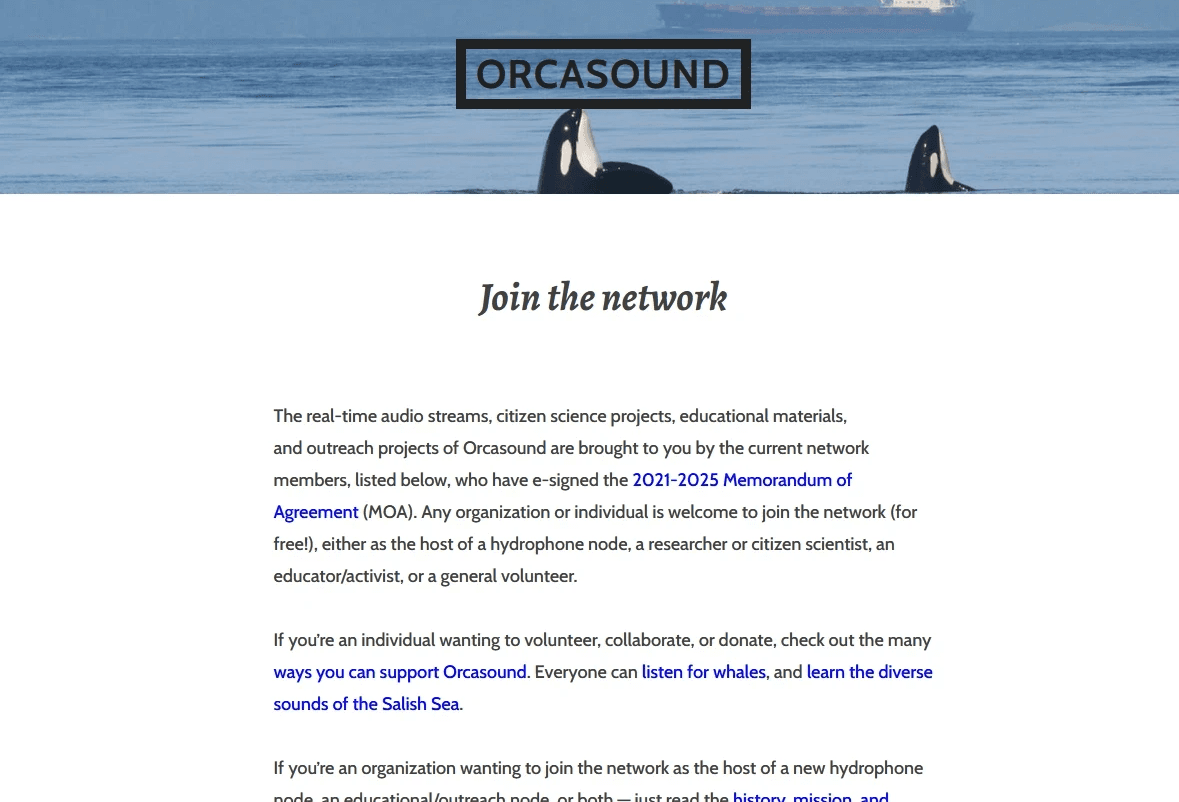 The methods to donate or volunteer on Orcasound's home site are either outdated or hidden in a wall of text